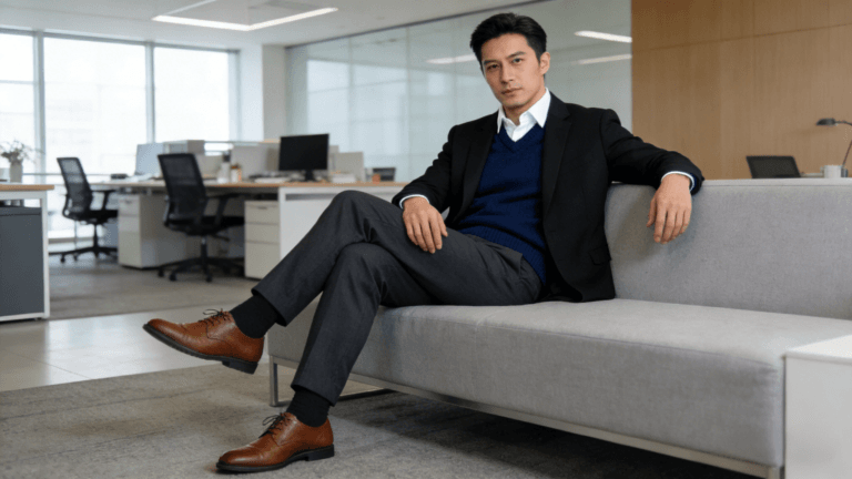 A shirt-collar sweater is a versatile choice for spring, and its popularity only grows with good reason. It looks good whether it is worn inside a jacket or directly outside—slip it under a tailored blazer for a smart-casual office ensemble, or layer it over a plain white tee for a relaxed weekend outing. A simple and loose sweater is paired with a pair of slacks to perfectly cover the flesh and make you look thinner and taller, elongating the torso and creating a streamlined silhouette that flatters every height. What sets this style apart is its ability to transition seamlessly between settings, making it ideal for men who value both style and practicality.
